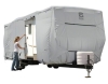 Triple-ply top and single-ply sides provide all-season protection. Air vent system combined with quick drying PermaPRO ripstop fabric repels water and protects against dirt and sun damage. Adjustable tension panels and elasticized hem corners. Integrated strap attachment and weighted toss bag system. Zippered storage bag. 4 Year Warranty. Fits Travel Trailers 20' - 22' length, 118" max height.