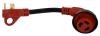 30 amp male plug - 30 amp 90 degrees female locking receptacle. 90 degrees female connector for reduced stress on cord and inlet. Detachable adapter with female ring. 12" length. Heavy Duty cable designed for outdoor use. LED power continuity lights. Male plug with finger grip for ease of use.