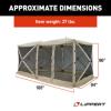 With space to fit the whole family, the Lippert Picnic popup gazebo provides shelter from bugs, rain and the sun's harmful rays. Breathable mesh screen walls to enjoy fresh, bug-free air. Comfortably accommodates 8-12 people in 128 sq. ft. of space. Hub system design for easy set up and tear down within minutes. Two integrated lantern hangers for conveniently lighting up your space. Includes convenient carry bag, five tie downs and 11 heavy-duty stakes for secure fastening. Zippered privacy divider included to separate gazebo into two spaces. Water-resistant material keeps moisture out. Made from flame-retardant material.