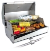 warming rack, integral folding legs for tabletop use, stay-cool handle, latching lid, built-in thermometer & piezo ignitor. Dimensions: 27"L x 15"D x 13"H.