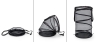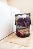 Lightweight laundry hamper pops open for use and collapses flat for storage. Mesh sides allow for more airflow than standard laundry hampers. Looped tie downs keep the hamper flat when not in use. Durable carrying handles. Measures 24" H x 16"D.