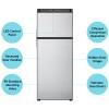 Features reversible stainless steel doors with curved edges, providing an upgraded appearance with enhanced/modern styling. Taller door panels provide a more built-in look. Includes hidden hinges and recessed door handles. Travel latch keeps the doors closed during transit. Night Mode reduces compressor and fan speed to conserve battery charge and reduce noise. Includes adjustable glass shelves with front risers and dual crisper drawers for storing vegetables and more as well as clear door bins. Includes RV-standard mounting holes for easy installation without brackets. Also has separate LED lights for refrigerator and freezer compartments and separate temperature zones for fresh food and freezer sections. Manual defrost extends the battery charge. Drip tray for condensation with accelerated evaporation. 59 7/8" x 23 1/2" x 24"