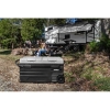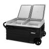 Camco's Portable Refrigerator keeps your food and drinks cold while on-the-go. It is ideal for road trips, RVing, camping, boating and tailgating. Electric powered, the cooler plugs into standard 120V AC outlets and 12V DC vehicle outlets for superior, regulated cooling. It features dual zone cooling with two internal compartments that allows you to independently cool and freeze at the same time. The temperature can be adjusted between -4° F to 68° F and has two cooling modes: ECO and MAX. A LED control panel provides a digital display that is easy to read and adjust. For nighttime use, interior LED lights allow you to see your cooler contents in limited lighting. The cooler is smart phone compatible, providing remote access via the mobile app. Bluetooth capabilities allow easy connectivity. This polymer cooler has reinforced exterior corners for durability. It has (2) wheels and an extendable aluminum handle that allow you to roll the cooler for easy portability. The cooler has a 75-liter storage capacity that accommodates up to (114) cans. A removable wire basket provides maximum storage space for food and beverages. (2) drain plugs (one in each compartment) release excess water for easy clean up. A 3-mode low voltage protection feature for 12V DC outlets helps prevent dead car batteries or enable a deep draw on dual batteries. Product includes (1) 7-foot A/C adapter and (1) 11-foot 12/24V cigarette lighter plug adapter. Measures 32 ½-inches (W) x 21 1/8-inches (D) x 18 7/32-inches (H) and weighs 54 lb.
