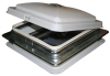 Self centering metal base with radius corners. Interior garnish with wider 1-1/4" flange and radius corners. Rugged to withstand excessive wind and weather. Attractive - designed for good looks and lasting durability. Truly universal. Fits all existing R.O.'s. Covers all existing screw holes in roof. One piece seamless frame, deep drawn metal base. Covers all interior stains left by former garnish rings. Positive-seal weather stripping is leak resistant and water tight. Interchangeable with existing Ventline products. 14" x 14" - 1-1/4" W x 2-1/8". White garnish.