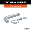 Also included in this towing starter kit is a CURT hitch pin & clip #21403. This hitch pin features a 1/2" diameter and is constructed from solid steel to ensure reliable strength. It also comes with a zinc finish and a grooved end that allows the clip to be inserted at any angle. All CURT 1/2" pins come with a 105-degree bend, making them easier to handle and operate when mounting your ball mount, and they will fit any CURT ball mount or hitch-mounted accessory with a 1-1/4" x 1-1/4" shank.