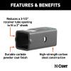 This CURT reducer sleeve adapter converts a 2-1/2" x 2-1/2" receiver tube opening to a 2" x 2" opening. It installs easily and is compatible with virtually any 2-1/2" x 2-1/2" hitch. Its gross trailer weight capacity and tongue weight capacity are limited to the hitch.