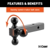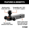 If you own more than one trailer, you know what a hassle it can be switching back and forth between ball mounts and keeping track of which ball mount fits which coupler. CURT has made things simpler with the multi-tow ball mount. These ball mounts feature two or three trailer balls mounted onto a straight shank to accommodate various coupler sizes and loads.This multi-ball ball mount features a 1-7/8", a 2" and a 2-5/16" ball. The 1-7/8" trailer ball can tow up 5,000 lbs. of gross trailer weight and 500 lbs. of tongue weight. The 2" ball can handle 7,500 lbs. of GTW and 750 lbs. of TW, and the 2-5/16" ball accepts loads up to 10,000 lbs. with 1,000 lbs. of TW. This multipurpose ball mount also features a dual-length option and has a solid shank for increased strength. All of our multi-use ball mounts come with a gloss black powder coat finish and a 2" x 2" shank.CURT multi-tow ball mounts are an obvious choice for anyone who tows more than one trailer on a regular basis. The multiple-ball design allows for quick changes between ball sizes without needing to install or own an entirely different ball mount. Because the balls are permanently welded to the shank, these ball mounts are also very secure, eliminating the possibility of a ball coming loose and deterring any potential theft.
