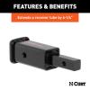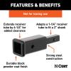 This CURT receiver adapter/extender converts a 1-1/4" x 1-1/4" receiver tube opening to a 2" x 2" opening. It installs easily and provides 6-1/4" of extra clearance for a bumper or spare tire. It has a tongue weight capacity of 350 lbs. but is not intended for towing use to pull any amount of gross trailer weight.