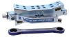 Scissors type locking chock prevents trailer from rolling. Locks tandem wheels by applying opposing force to tires. Aids in trailer stabilizing, stops tire shift. Extends from 2-1/2" to 10". Rust inhibitive coating. Plated ratchet wrench with comfort bumper. Lightweight, easy to store. Lockable design with optional 28015 Pad Lock.